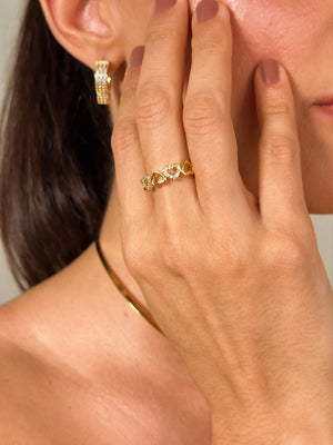 Adicione um toque de romance e brilho ao seu visual com o Anel Coração Cravejado. Com cinco corações este anel é garantia de sofisticação e elegância. Banhado a ouro 18k, é ideal para eventos especiais ou para dar um toque de luxo ao seu dia a dia.