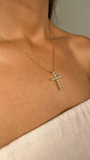 Este colar elegante apresenta um pingente de cruz cravejado em dourado com um banho de 18k ouro. Perfeito para adicionar um toque de sofisticação e estilo a qualquer look. Feito com materiais de alta qualidade, este colar é resistente e durável, garantindo que você possa usá-lo por muitos anos.