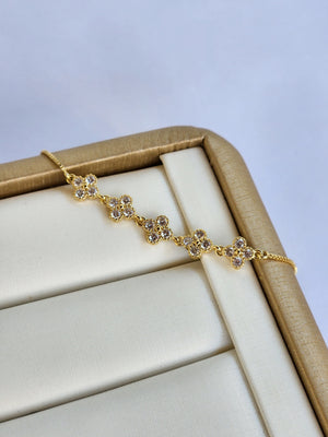 Desenvolvida com cinco trevos em relevo, esta pulseira dourada é perfeita para quem busca um toque de sorte e elegância. Feita em metal durável, pode ser usada em qualquer ocasião, acrescentando um brilho sutil ao visual. Um acessório único que combina beleza e simbolismo.